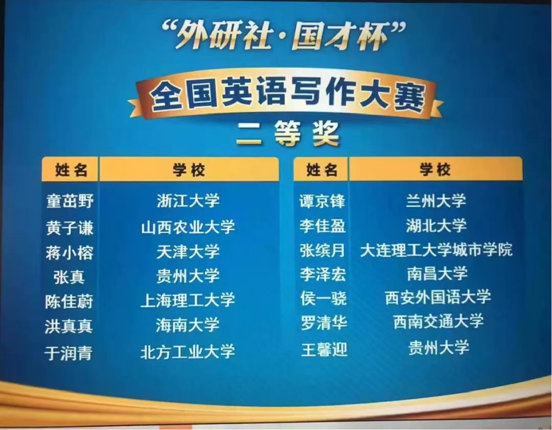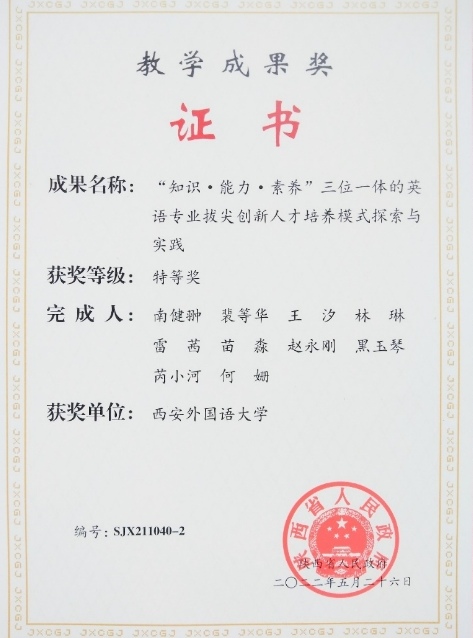 获“课程育人先进集体”称号。7名教师在中西部地区高等外语课程思政教学设计大赛中斩获5个奖项,其中个人赛特等奖、一等奖、二等奖各1项、团队赛二等奖2项。获批学校“三进”教学改革研究项目3项(其中重点项目1项,一般项目2项);英语学术写作II,英语视听说、英语学术写作I、应用语言学研究方法等获批学校本科课程思政示范课程,应用语言学获批校级研究生课程思政“三进”示范课程。