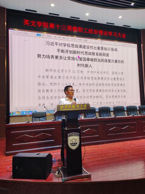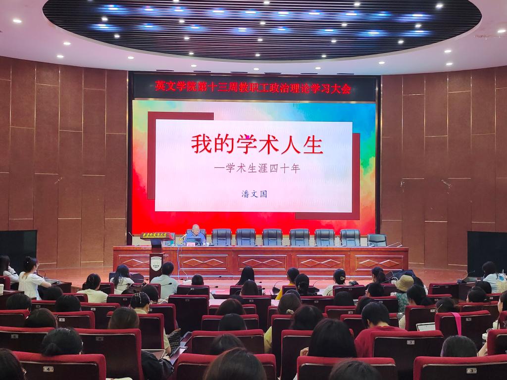 在长安校区实验楼A区105会议室召开第十三周政治理论学习会。本次大会特邀华东师范大学潘文国教授为我们做题为《学术生涯四十年》的讲座。会议由副院长雷茜主持,全体教职工及部分学生代表参会。