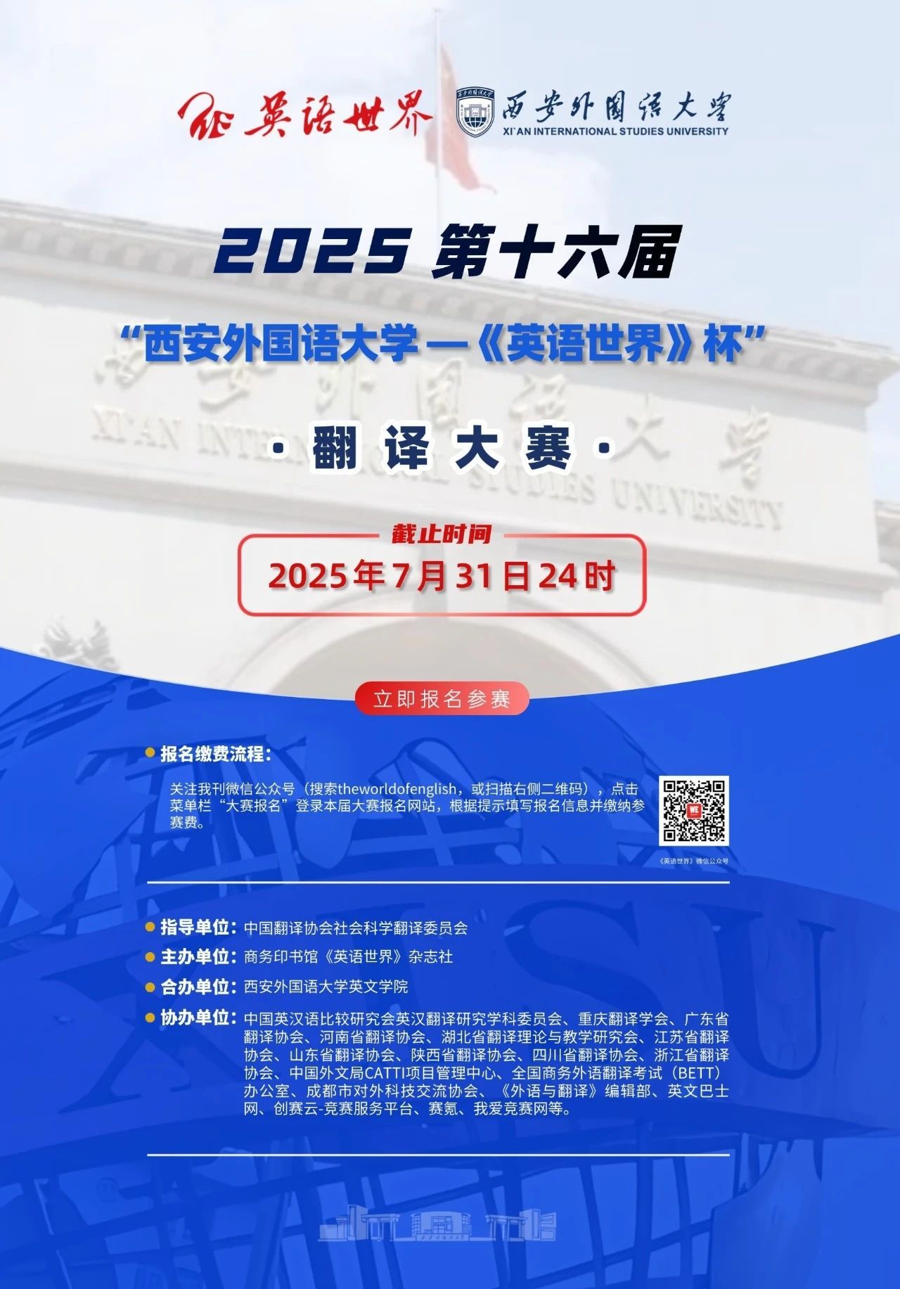 第十六届“《英语世界》杯”翻译大赛得到西安外国语大学的大力支持,并由该校冠名本届比赛。2025 年的翻译大赛包含“英译汉”和“汉译英”两个组别。大赛初评由合办院校及《英语世界》编辑部负责;复评和终评将延续历届传统,从全国各地邀请知名翻译专家进行评审,以确保大赛评审的权威性和公信力。