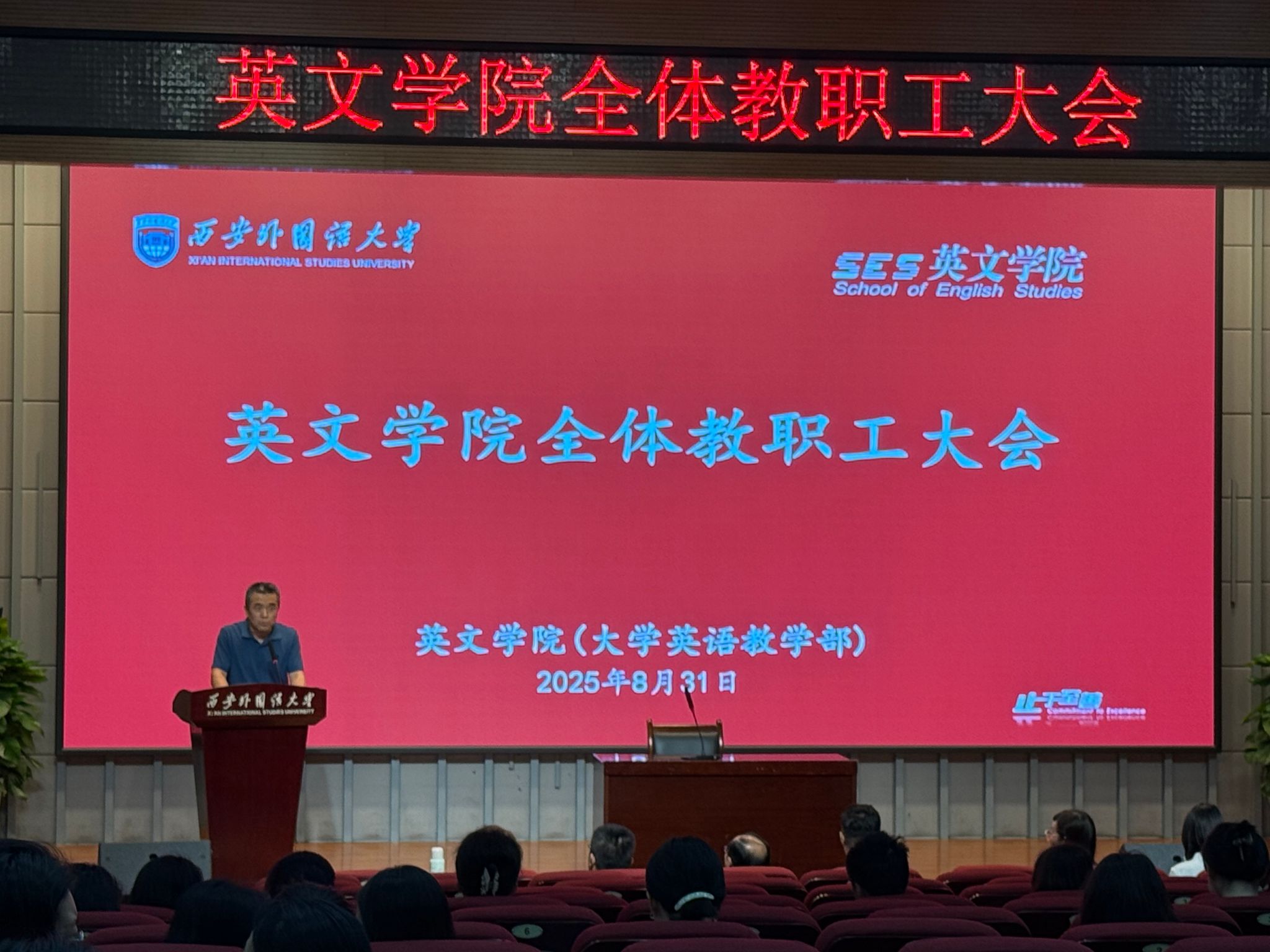在长安校区教学楼A区111报告厅召开新学期教职工大会,副校长黄立波出席,全体教职工参会,会议由党委书记王刚主持。