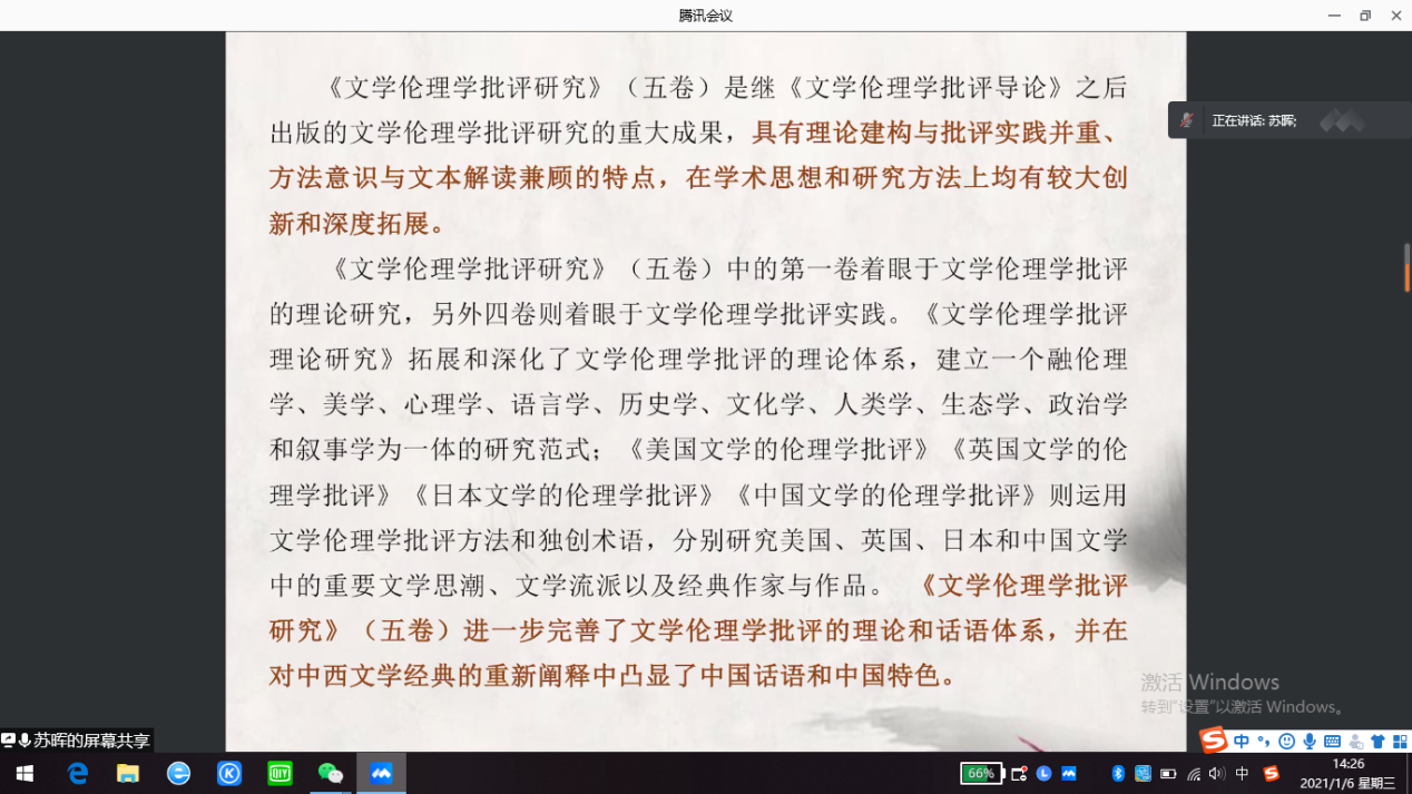 其次,苏晖教授强调了文学理论和方法研究的中国话语建构。本部分主要以其学术论文“学术影响力与国际话语权建构—文学伦理学批评十五年发展历程回顾”为文本,讲述了中国文学伦理学批评的发展。文学伦理学批评是聂珍钊教授于2004年在学术会议上提出,至今已走过了十六个春秋。随着文学伦理学批评伦理体系和话语体系的初步形成,诸多学者也参与到文学理论学批评理论的评论与构建中,使之得到进一步推广和丰富。具备了“走出去”并争取国际话语权的良好基础和条件,文学伦理学批评在国际学术界也得到了好评。这表明中国理论正在走向世界、走向繁荣,充分展现了中国学者的学术自信和创新精神。