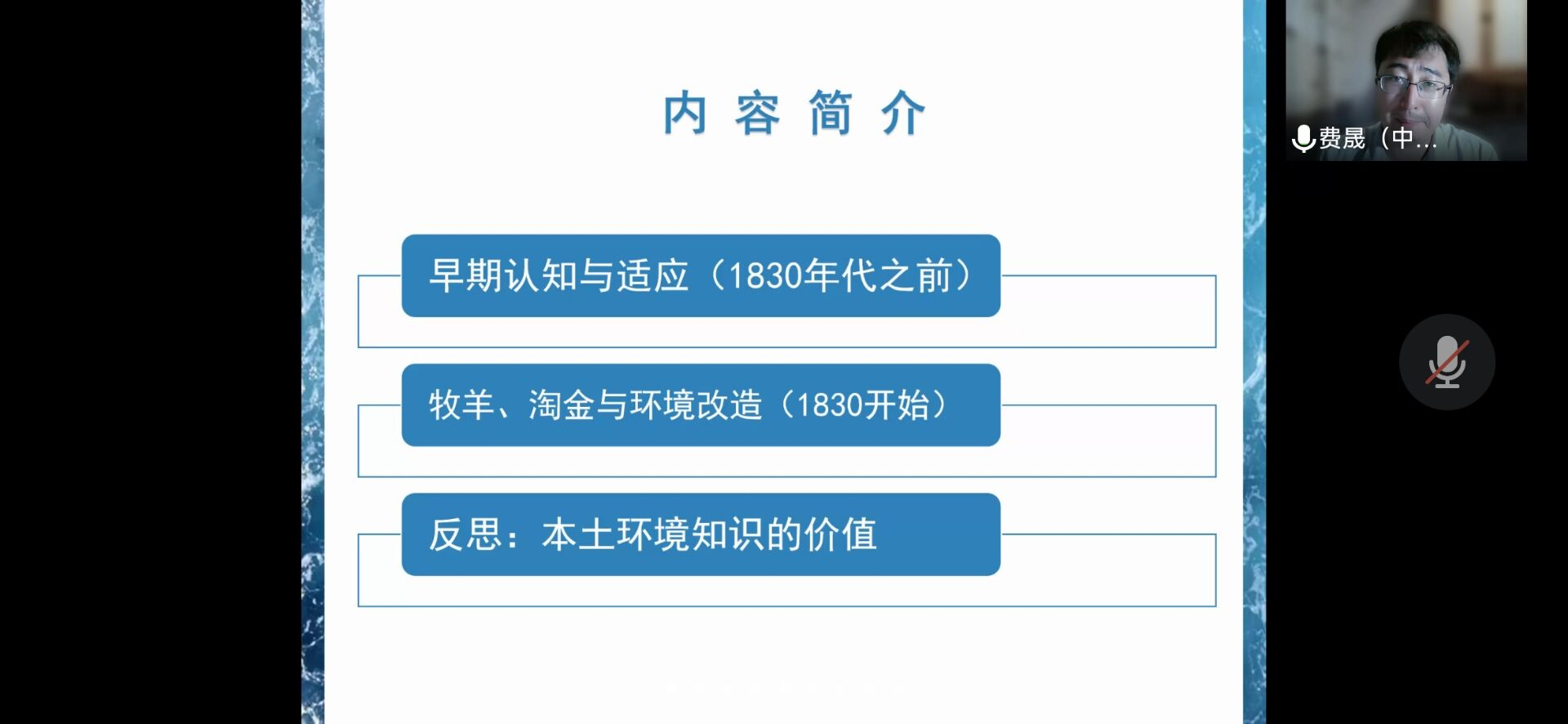 费教授的讲座围绕早期认知与适应;牧羊、淘金与环境改造;反思:本土环境知识的价值这三方面深入展开。讲座伊始,费教授向大家讲解了澳大利亚环境的基本特点,即地理隔绝、地质古老、气候变化急剧、生态体系单调。1768年库克船长的航行,开始了对这一地区的认知先行。1770年,约瑟夫·班克斯(Joseph Banks)第一次看见了澳大利亚,并对该地区的生态环境做了记录。英国向澳大利亚派出的“第一舰队”,开始了澳大利亚被殖民的历史。