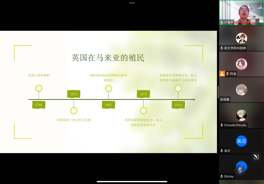 最后,王慧中博士向与会师生讲述了马来西亚的殖民史,包括东南亚殖民时代和英国殖民时代,重点讲解了英国殖民。王博士表示,英国直接管理的殖民模式对马来西亚的发展产生了重要影响,包括两个方面:在经济上,英国将马来亚拉入世界经济体系;在民族关系上,分而治之的管理模式促成了马来西亚独立后的族群问题。