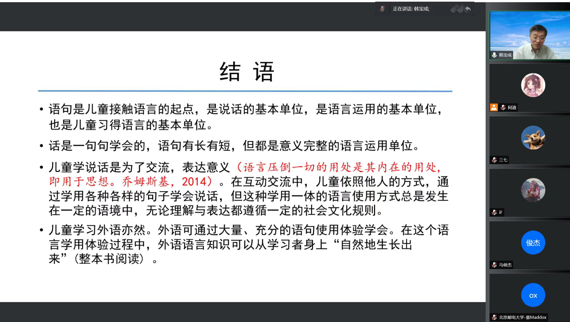 韩教授的讲座涵盖四大模块:儿童外语教学的“基点”、传统外语教学的本位观及其局限、语句习得假说及其理据以及语句习得假说的意义和价值。