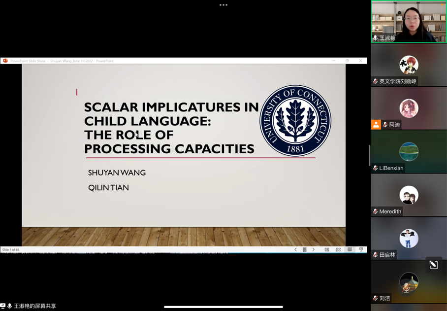 接下来,王淑艳详细介绍了关于孩童与成人工作记忆的两个实验设计,并对其数据结果进行了详细解读。她解释到:实验结果表示孩童的工作记忆与其对等级含义的处理具有密不可分的关系。同时,实验结果证明了语言处理能力限制和等级含义推理存在关联。随后,针对语言处理派与词汇学家派的不同观点,王淑艳就第三个实验设计及分析结果进行了解释:实验结果支持语言处理派的观点,同时也揭示了等级含义处理能力形成所必须经历的复杂过程,实验结果也表明只有当孩童具有相应的语法知识时,语言处理能力才会主导孩童的等级含义处理。最后,王淑艳对102名成人的实验结果进行分析解读:成年人在高记忆负荷的情况下会处理更少的量词等级含义。讲座最后,王淑艳与田启林博士同与会师生深入交流,并对提出的问题进行详细解答。