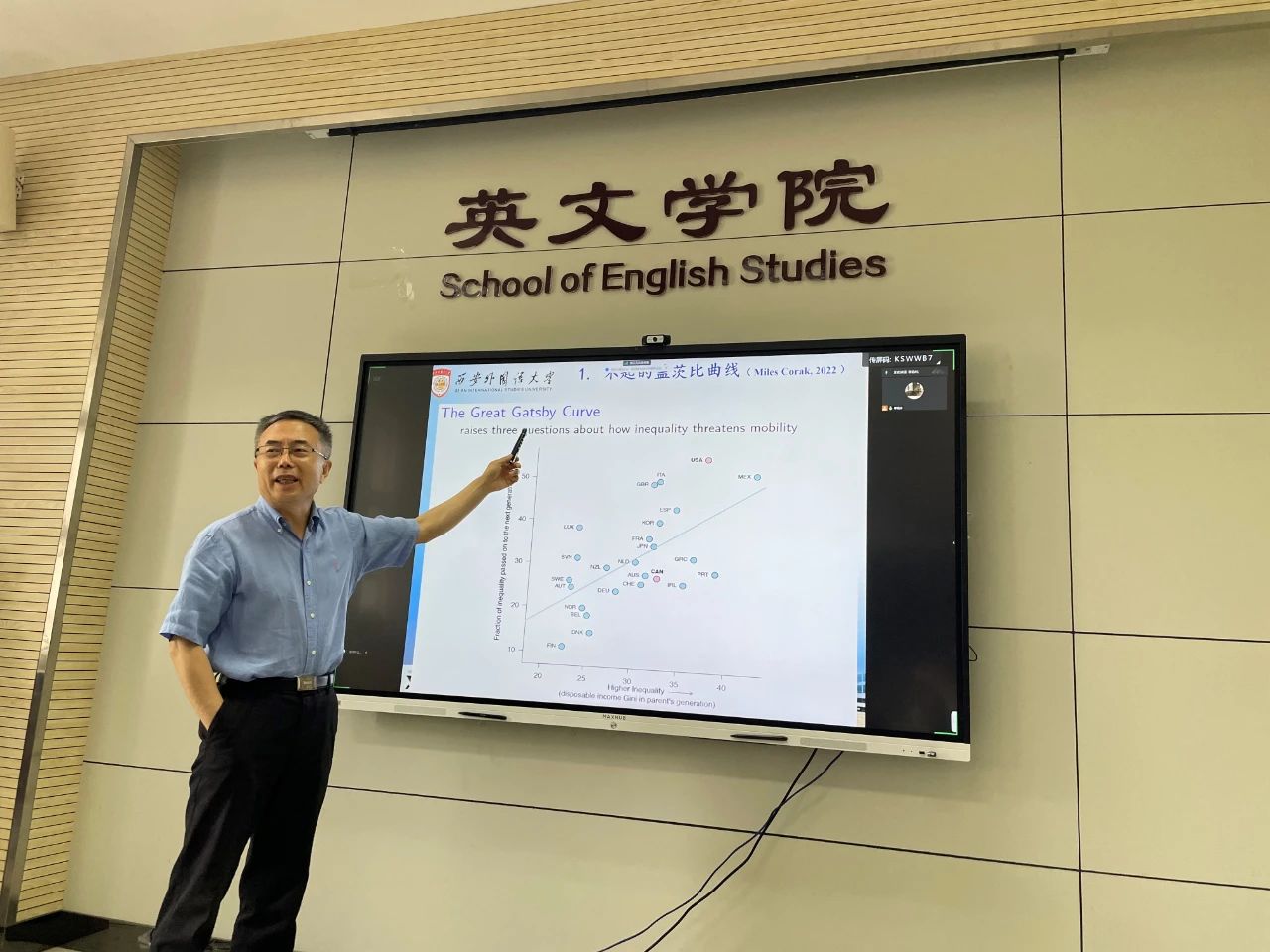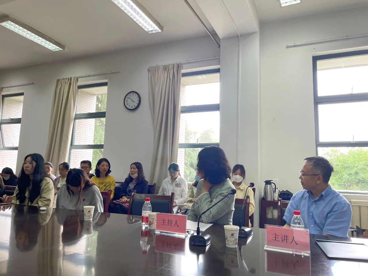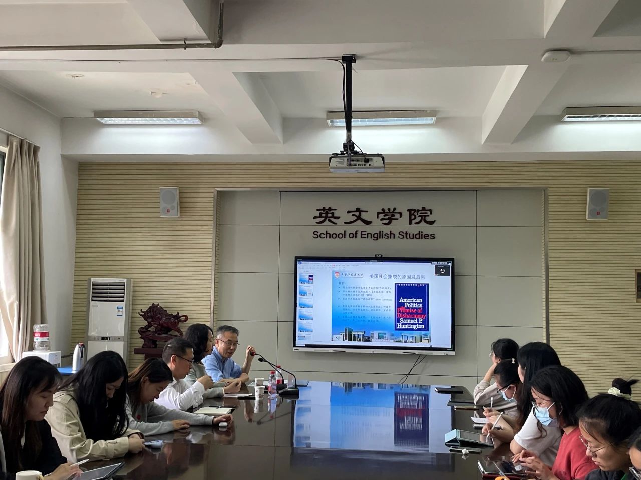 在讲座的尾声,李辉教授同与会师生进行了生动的交流互动,并针对老师和同学们提出的问题进行了耐心的解答。整场讲座以因果关系为结构,清晰地呈现了美国社会撕裂的原因及后果,引用了大量的文献资料,使得与会师生更加深入地认识与理解美国社会。离开之际,全体师生向李辉教授表达了诚挚的感谢,本次会议圆满结束。