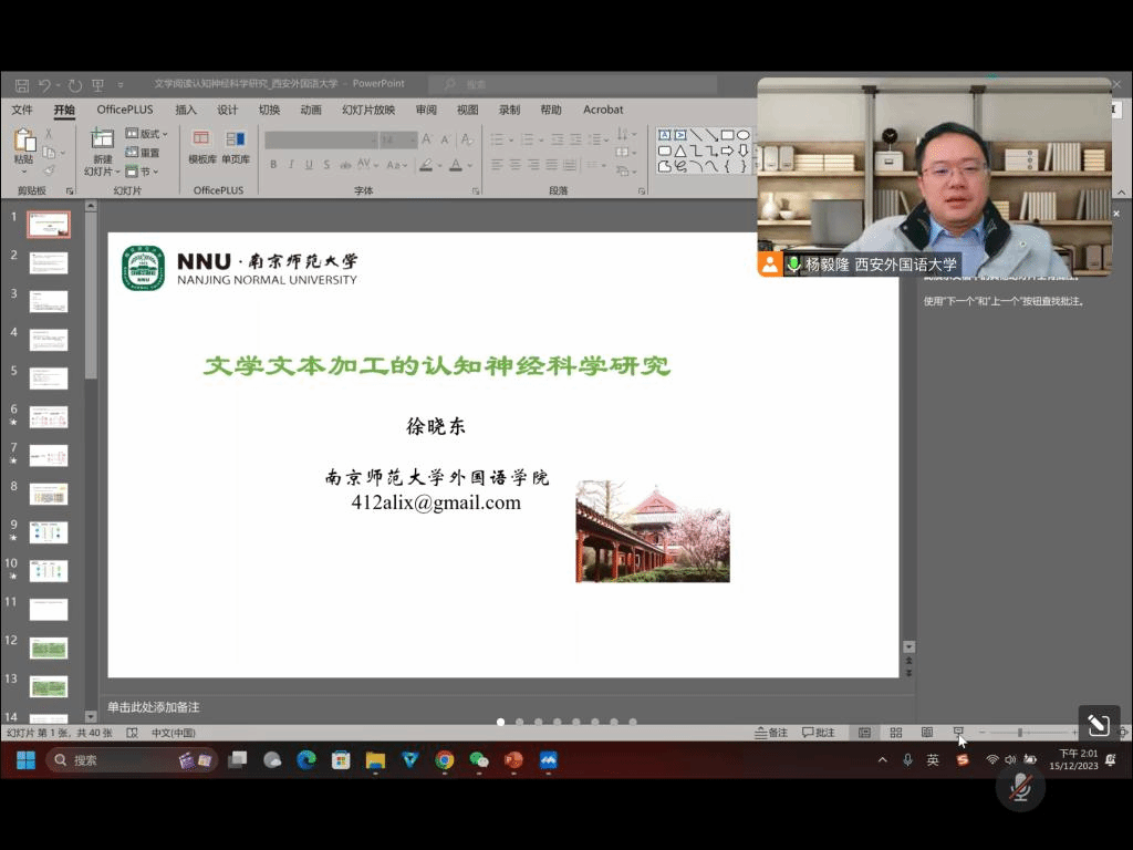 师生作题为“文学文本的认知神经科学研究”的线上学术讲座,本次讲座由杨毅隆教授主持,共计100余名师生在线聆听讲座。