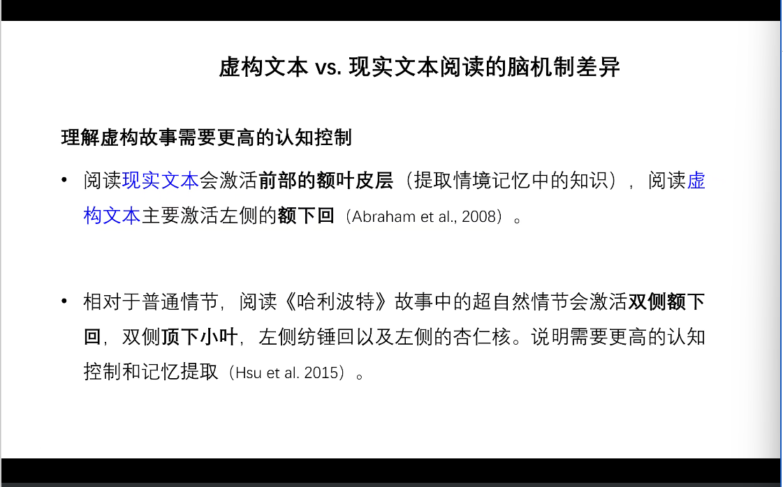接着,徐晓东教授给我们介绍了面对虚构文本和现实文本阅读时脑机制的差别,具体介绍了虚构文本中的超自然文学,以翔实的实验数据为我们总结了以下结论:理解虚构作品需要付出更多的认知努力、激活更多的大脑区域、读者通过心理模拟机制来理解超自然故事、高水平读者更善于借助于模型系统来理解虚构文学作品等。