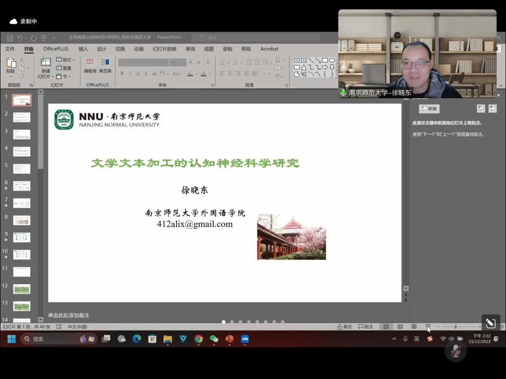 其次,徐晓东教授给我们分享了运用脑电实验分析文学阅读如何提高违实推理的过程,并且用生动的例子,严谨的实验结果给师生们介绍了小说的叙述视角、转述方式、聚焦方式是如何影响读者的阅读过程和大脑反应的。