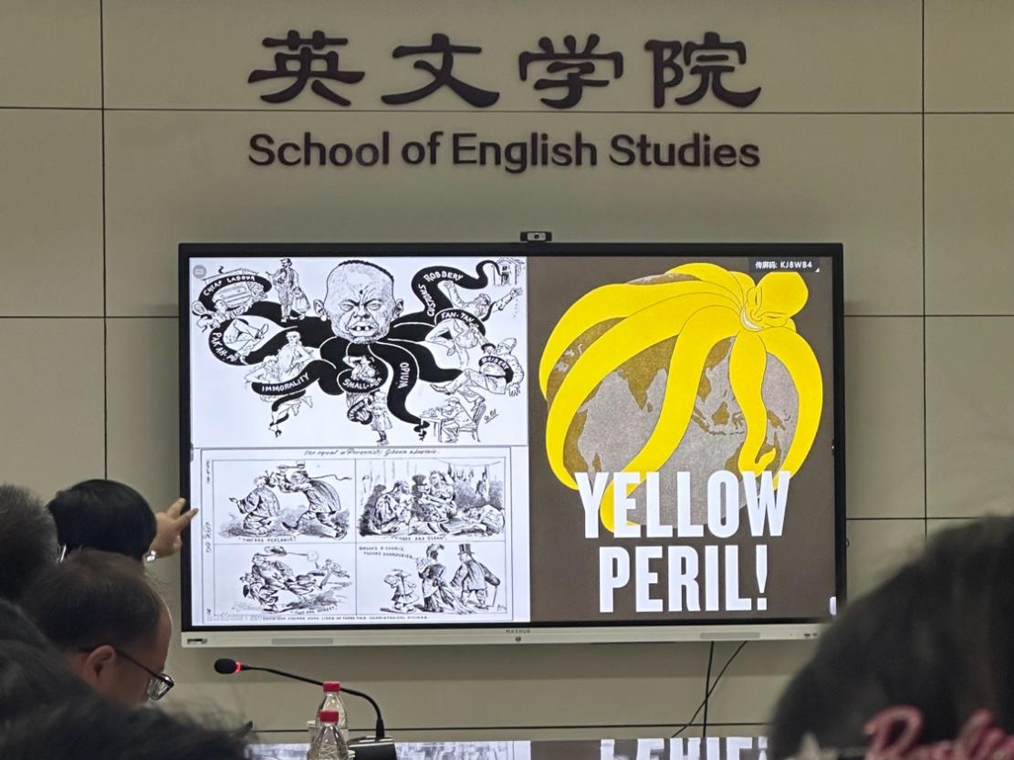 讲座伊始,陈弘教授由自己研究方向的转变对本次讲座题目做了一个解读,他提到,本次讲座以文学为切入点,最终聚焦于澳大利亚文化研究。接着,他以澳大利亚电影Tomorrow When the War Began为引入,介绍了澳大利亚文化热衷于塑造亚洲人入侵的叙事,以图片与漫画的形式展示了澳大利亚文化中对于中国华人形象的刻板印象。同时,详细阐释了“黄祸”论在西方特别是澳大利亚文学中的具体体现。