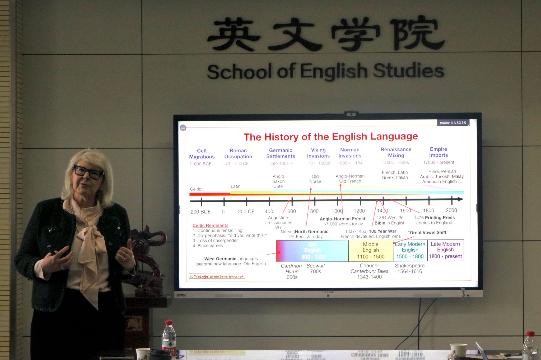 讲座伊始,Filippis博士选取了乔叟的《坎特伯雷故事集》中的一篇故事作为切入点,通过列举书中流传至今的经典词句,深入探讨了乔叟作为“英国文学之父”的历史地位。她强调,乔叟不仅是英语语言的“发现者”,更是其发展和传播的推动者。Filippis博士详细分析了乔叟的作品如何受到但丁的《神曲》和薄伽丘的《十日谈》的影响,这些作品不仅在创作模式上对乔叟有所启发,更在语言的使用上产生了深远的影响。她指出,乔叟的作品将英语带入了英国大陆,并为其最终成为官方语言奠定了坚实的基础。