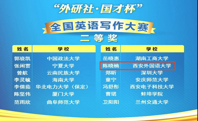 学生陈晓楠荣获全国英语写作大赛二等奖。