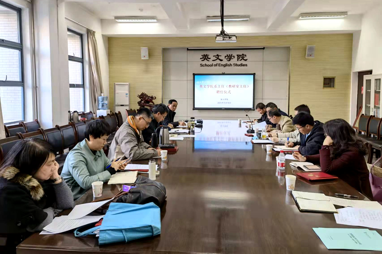 系主任(教研室主任)聘任的通知》,聘任薛小惠同志为英语文学系系主任,杨毅隆同志为翻译系系主任,马俊杰同志为语言学系系主任,苏锑平同志为国别与跨文化研究系系主任,林琳同志为写作教研室主任,张迪晨同志为大学英语第一教研室主任、徐斌同志为大学英语第二教研室主任。向各位新主任表示感谢和祝贺,与南健翀院长共同颁发了聘书。