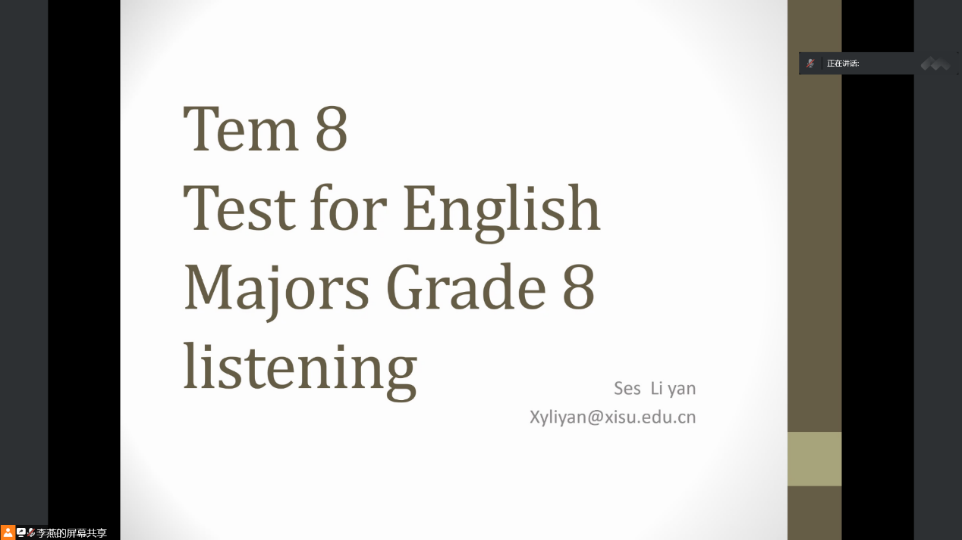 6月2日,李燕老师进行了英语专业八级听力考试的专讲。李燕老师首先对题型分布和时间安排进行了总体介绍,并且给出了考试时答题的注意事项和技巧。李老师指出,不要急于把第一次听的答案一次性写到答题卡上,要边听边记;在答题卡发下来时要开始读题,为考试做准备。同时李老师还强调了练习的重要性,多练才能取得好成绩。接着,李老师以2021年真题为例,带着同学们看了题目中的重点难点和解题技巧。李老师提醒同学们在考试时没听到的部分也不要放弃,在听力后面部分可能还会再次提到,一定要认真听。