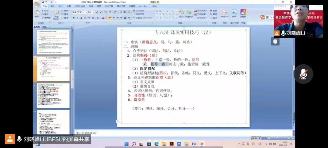 6月9日,刘晓峰老师进行了“专八翻译实训与解析”讲座。刘老师首先对专八通过率进行了分析,强调了专八的重要性。其次刘老师给出五个专八翻译要点建议,分别是避免背诵模板、避免明显语法和拼写错误、避免词汇单一和结构简单化、避免同词多次出现以及加强翻译显化趋势。刘老师列出两点汉译英实用技巧:一是忠实语境意义和原文,二是翻译通顺(合乎语法、结构衔接、逻辑连贯、习语和篇章化),并以2019、2018和2014年的专八翻译真题为例,对技巧和要点进行分析应用。最后,刘老师对本次内容进行了总结,并以同学们的翻译答案为例一起寻找错误进行指导。