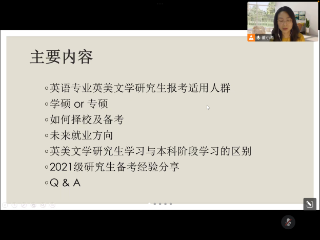 在讲座中,董老师从英语专业英美文学研究生报考适用人群、学硕与专硕的区别、如何择校及备考、未来就业方向以及英美文学研究生学习与本科阶段学习的区别几个方面向同学们进行了讲解。董老师还说明了兴趣在考研方向选择中的重要性,以及研究生学习与本科学习的不同,特别强调研究生学习是需要自律与创新并存的。