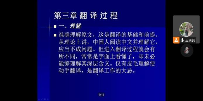 特邀王满良老师做了翻译方向的考研答疑讲座。讲座中,王满良老师主要从汉英语言差异、翻译过程、翻译技巧、习语翻译四个方面展开。