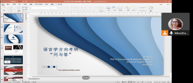 2022年11月30日,林琳老师为我院学生进行了语言学方向的考研答疑。本次会议在腾讯会议进行,参会同学认真聆听了林琳老师的讲座。
