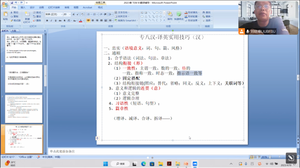 4月19日,刘晓峰老师进行了“专八翻译实训与解析”讲座。刘老师首先强调了专八考试的重要性,并分析了专八考试的题型。其次,刘老师提醒学生在考前要劳逸结合,不要过分紧张焦虑。刘老师同时给出四个“避免”和三个“建议”。刘老师列出两点汉译实用技巧:一是忠实语境意义和原文,二是翻译通顺;并以2019年的专八翻译真题为例,对技巧和要点进行分析应用。刘老师也为同学们推荐了相关的翻译书目,供参考学习。最后,刘老师对本次内容进行了总结,并以同学们的翻译为例,分析了典型错误。