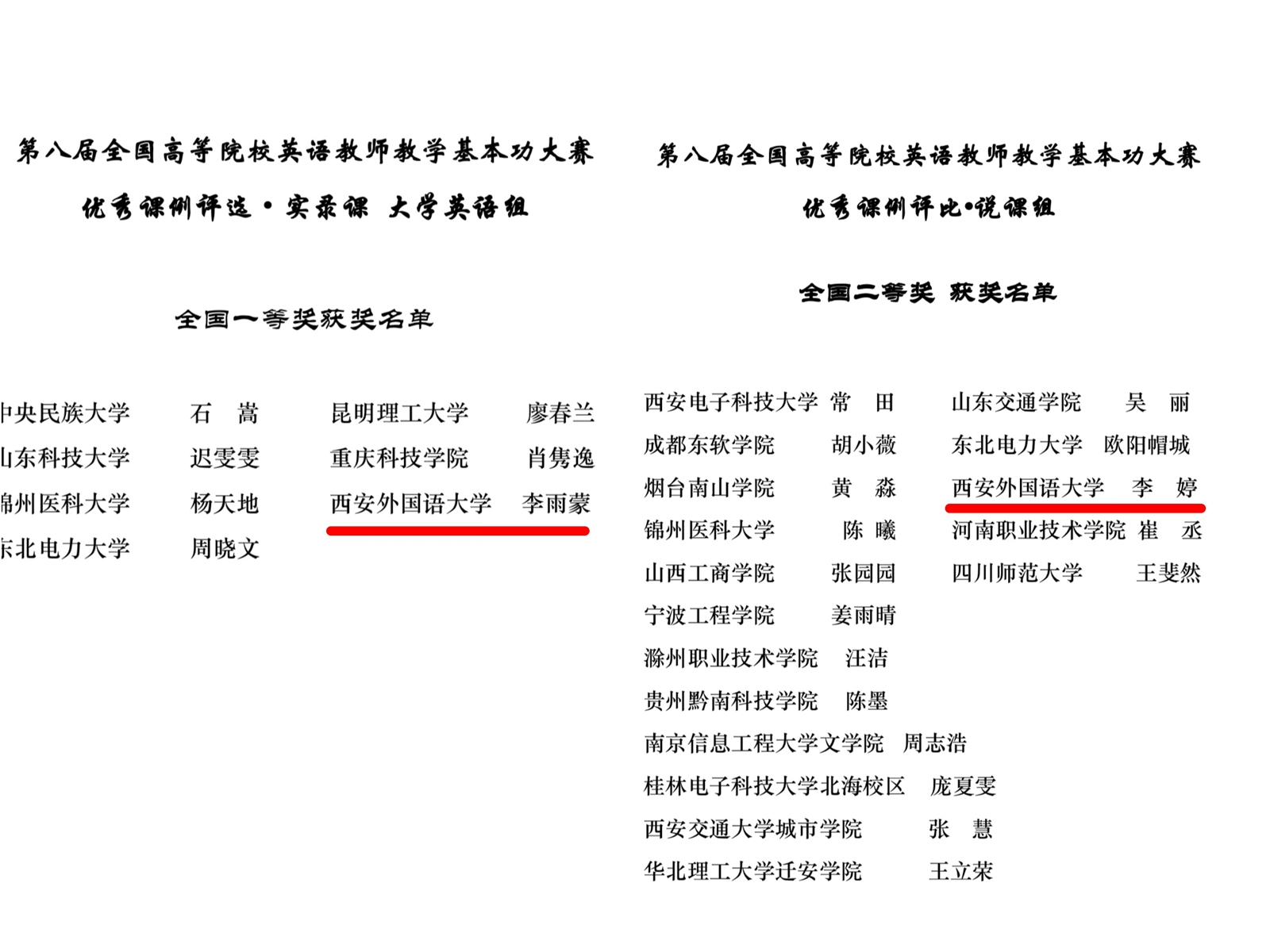 李雨蒙老师获实录课大学英语组全国一等奖省级一等奖,李婷老师获说课组全国二等奖和省级一等奖,马丽萍获微课组全国一等奖,苏锑平老师获微课组全国三等奖。