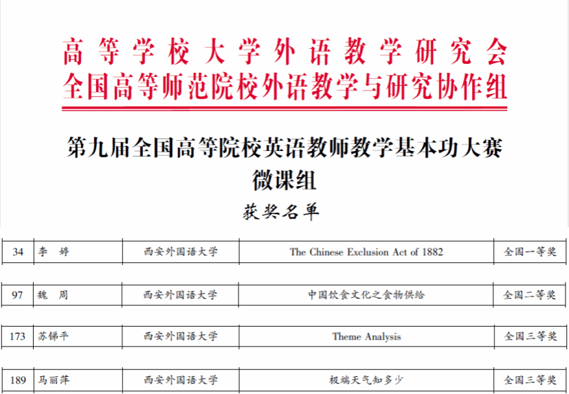 教师林琳成功斩获本次大赛实录课英语专业组“全国特等奖”和“最佳综合素质奖”两项荣誉;李婷、魏周、苏锑平和马丽萍分别荣获微课组“全国一等奖”“全国二等奖”和“全国三等奖”;李雨蒙获说课组“省级特等奖”。