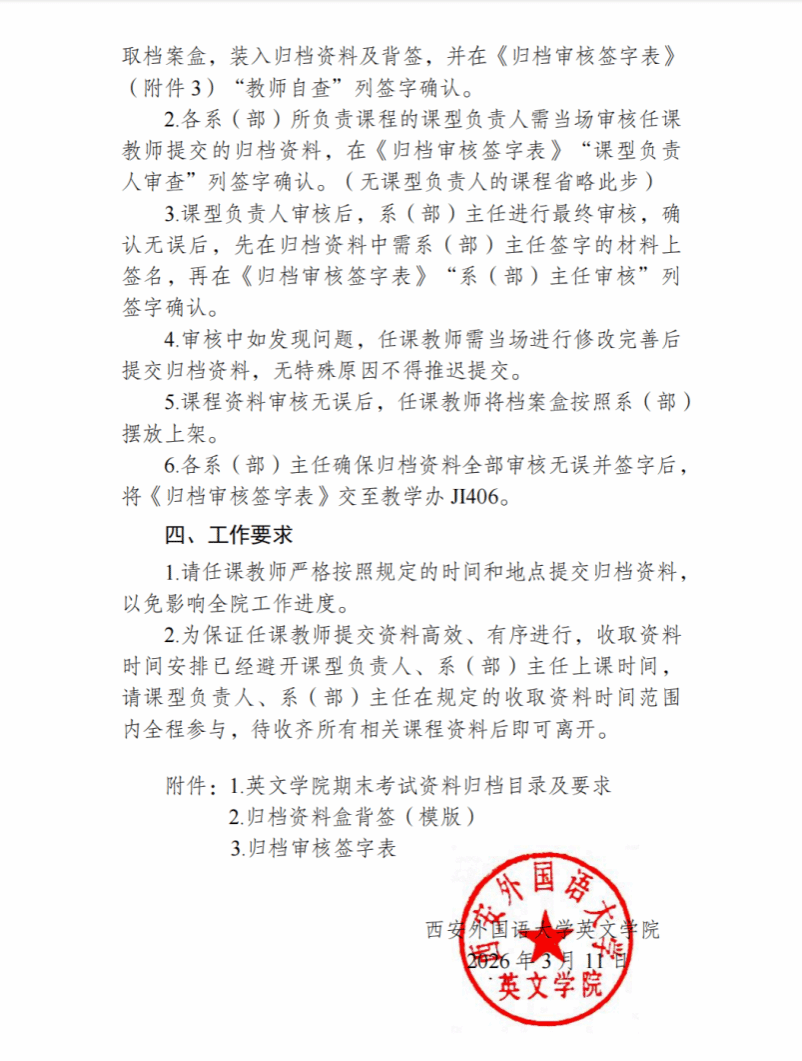 印发《关于做好归档工作的通知》,明确归档资料准备标准、分时段提交安排及三级审核流程,理顺“教师自查—课型负责人审查—系(部)主任审核”的归档管理机制。全院七个系(部)按照时间安排,于3月4日-20日有序开展教学档案归档工作,完成了总计535门课、两万余份试卷的整理归档。