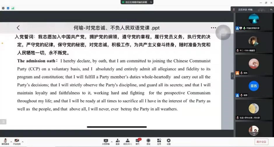 党委委员何瑜副教授主讲。整堂课程贯穿了双语互动的学术气氛,何瑜首先指出“对党忠诚”是中国共产党人首要的政治品质,接着用英语阐释了“对党忠诚不负人民”的内涵与意义,接下来在“红色红岩精神”与“时代楷模廖俊波”的视频播放中向学生党员们展示了“对党忠诚不负人民”的时代价值,最后,她激励全体党员“紧跟主旋律、与时代共频”,以实际行动践行伟大建党精神。
