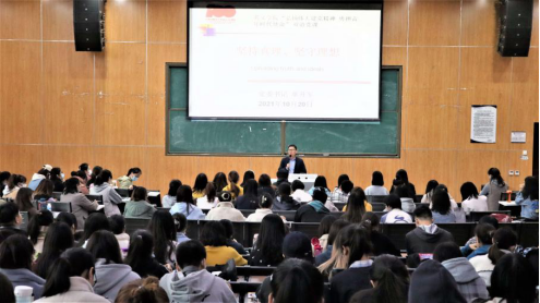 党委委员雷茜教授主讲。雷茜以“习近平总书记在庆祝中国共产党成立100周年大会上的讲话”引入主题,通过《觉醒年代》等视频片段展示了“陈延年”和“王进喜”两位英雄模范,并深刻讲解了共产党员“不怕牺牲英勇斗争”的重大意义。她指出,作为新一代中国共产党党员,我们应时刻践行“不怕牺牲英勇斗争”的伟大建党精神,充分发挥建党精神的现实意义,为实现伟大中国梦顽强拼搏和不懈奋斗。