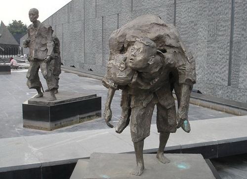 (二)遗址悼念区:该区包括"古城的灾难"大型组合雕塑、"历史证人的脚印"铜版路、《狂雪》诗碑墙、石壁墙与邓小平手写馆名、墓地广场、浮雕《劫难》《屠杀》《祭奠》、"母亲的呼唤"立雕、"万人坑"遗址陈列和悼念广场祭场、冥思厅等。