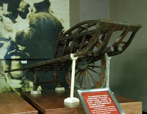 这是淮海战役期间,山东省泗水县模范运输团运粮的“功劳车”。该运输团接受了6天运粮4.5万公斤的任务,结果3天就运粮5.6万公斤,提前3天超额1万多公斤完成任务。战役中,大小车共计88.1万辆,可以说,一辆小车一个故事,几十万辆小车、几百万人民推出了淮海战役的胜利。