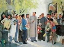 这时候,毛主席来临的消息已经传遍了这条巷子的家家户户,男女老少都涌到外面来。毛主席一在门口出现,人群中立即响起一片欢呼声,人们同声问候:“毛主席好!毛主席好!”。毛主席微笑地走着,不断向大家挥手致意。人群中一个胡须雪白的老人伸着手,总挤不到前面来,毛主席看见了,立刻向前两步,握住老人的手。、