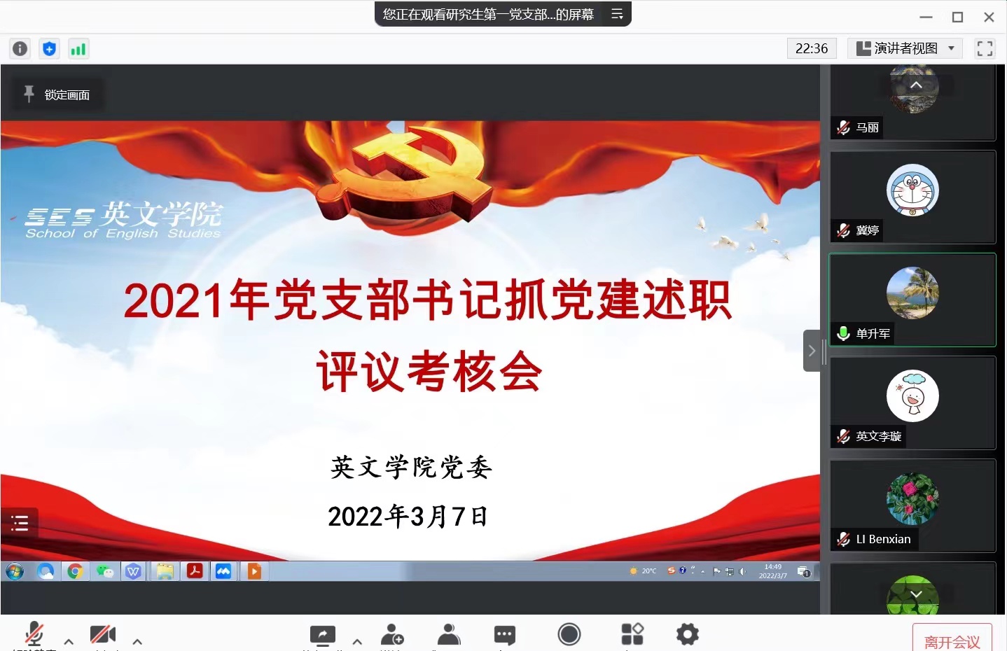3月7日下午,开云体育 党委以腾讯会议的方式召开2021年度党支部书记抓党建述职评议考核会,开云体育 党委书记单升军、党委副书记马文静、开云体育 17名党支部书记以及师生代表共计33人参加会议。